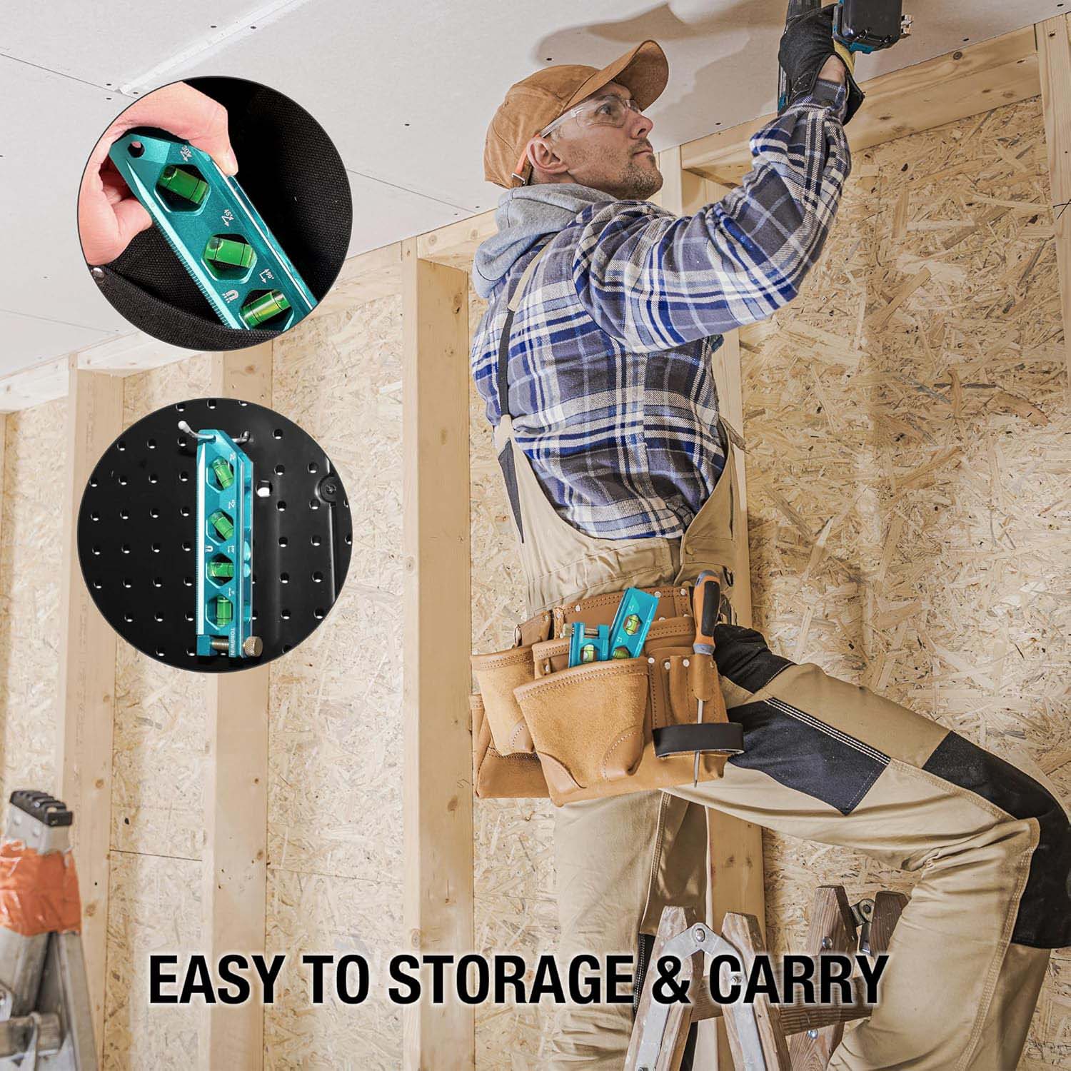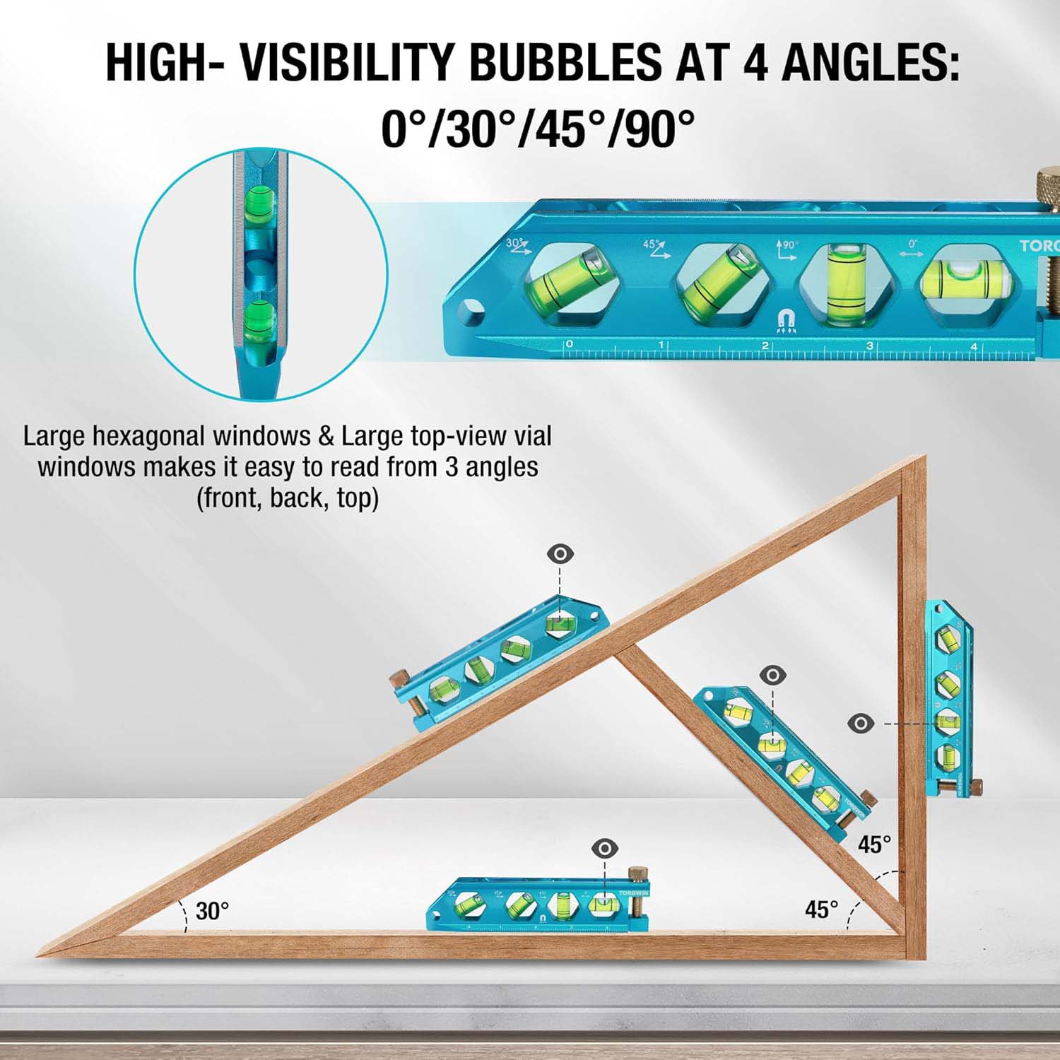 A magas láthatósági buborékok jelenléte 4 szögben (0 °/30 °/45 °/90 °) nagy előnye. Ezek a buborékok különböző irányokból jól láthatók, ami azt jelenti, hogy függetlenül attól, hogy standard vízszintes vagy függőleges szögben végezzünk méréseket, vagy olyan ferde szögekben, mint a 30 ° vagy 45 °, pontos leolvasásokat kaphatunk. Ez a többszögű buborék -funkció jelentősen javítja szintünk sokoldalúságát. Az olvasás pontossága fokozódik, mivel a buborékok pontosan kalibrálódnak. Például, amikor egy lejtős felület dőlésének mérése 45 ° -os szögben, a buborék helyzete nagyon pontos jelzést adhat nekünk a szögről, a hibaarány 0,05 ° -kal, összehasonlítva a kevésbé pontos buborék -kalibrálással.