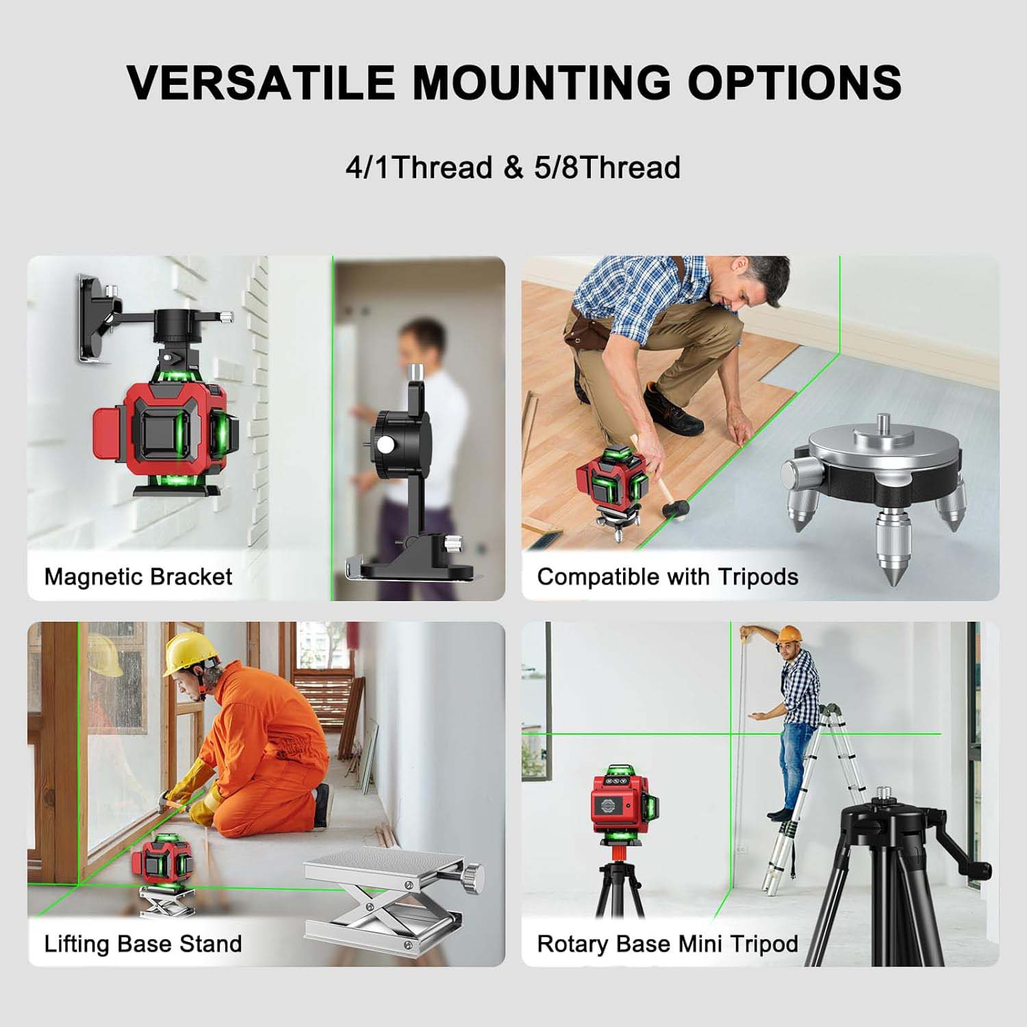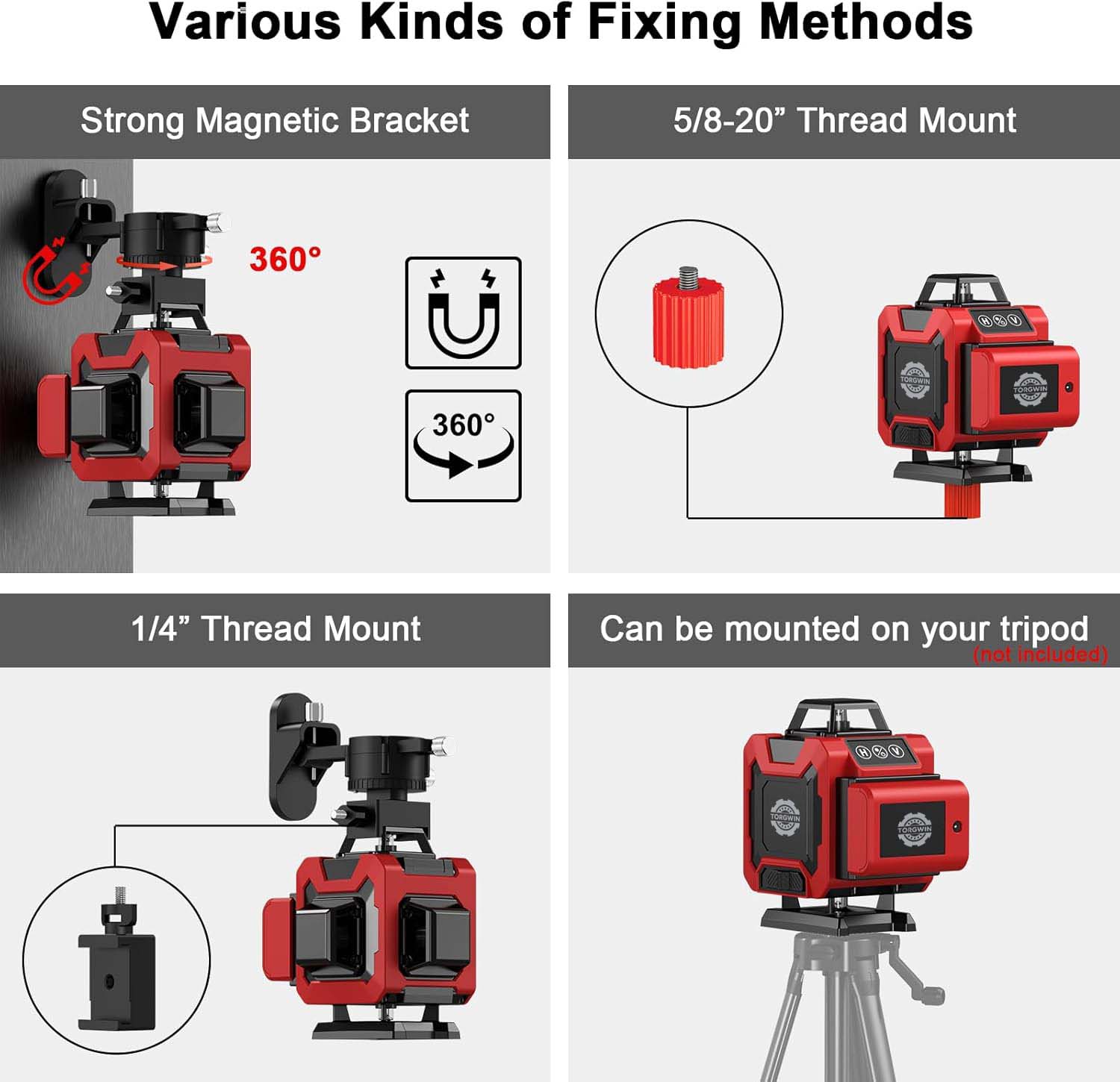 1. Különféle rögzítési módszerek:Erős mágneses konzollal van felszerelve, amely sok helyzetben stabil és kényelmes módot biztosít a lézerszint rögzítésére. Az 5/8-20" menetes rögzítő lehetővé teszi, hogy bizonyos eszközökhöz vagy szerkezetekhez csatlakoztasson ilyen típusú menettel. Az 1/4" menetes rögzítő egy másik rögzítési lehetőséget is kínál, növelve a kompatibilitást a különböző tartozékokkal.