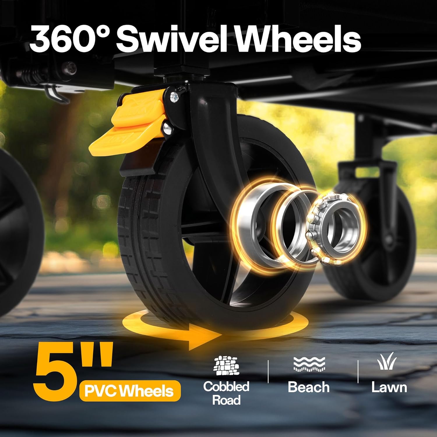 5 hüvelykes extra széles PVC kerekeket tartalmaz, mély futófelület mintákkal a maximális tapadás érdekében